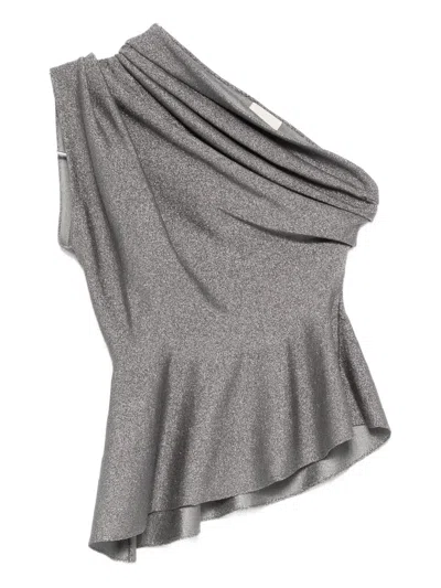 Aimee Asymmetric One-shoulder Draped Lurex Peplum Top In Gray