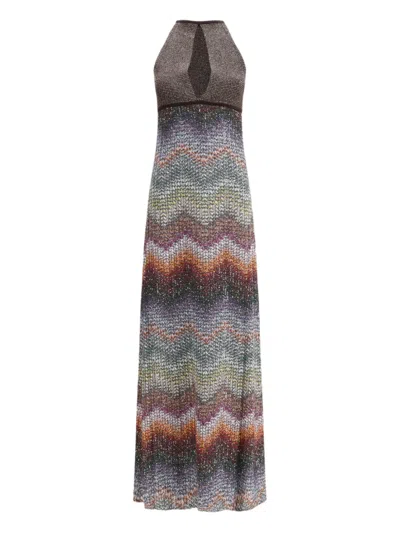 Long Halter-neck Dress In A Greek-style Zigzag Knit With Sequins Clothing In Multi