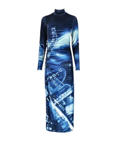 Gathered Velvet Long Dress Printed Pigalle In Blue