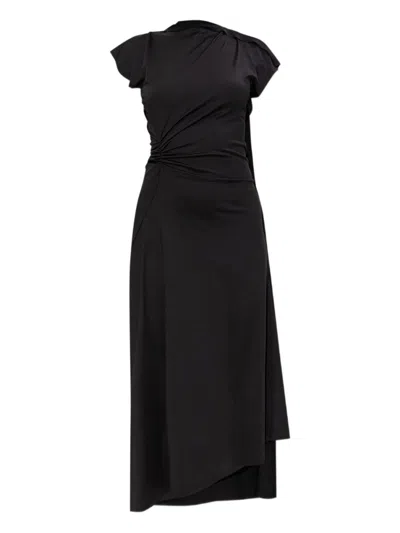Asymmetrically Draped Black Midi Dress With Soft Ruching