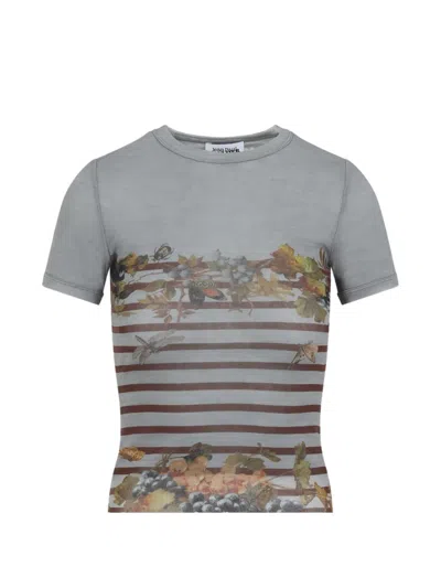 Short-sleeve Fitted Top With Floral Motif And Stripes In Gray