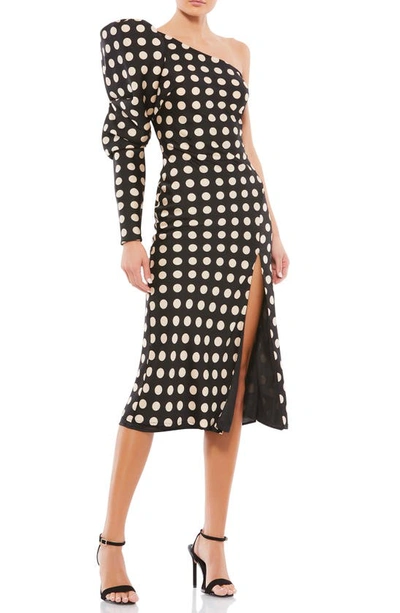 Long Puff Sleeve Polka Dot Tea Length Dress In Black White