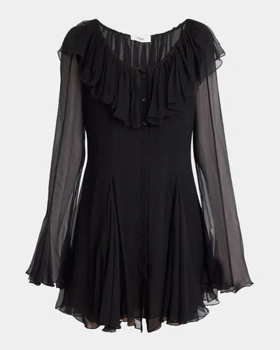 Ruffle Long-sleeve Silk Mousseline Mini Dress In Black