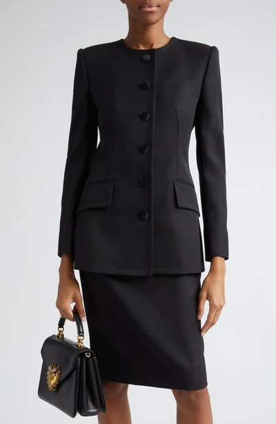 Wool Tailored Blazer Vestwith Satin Peak Lapels. In Black