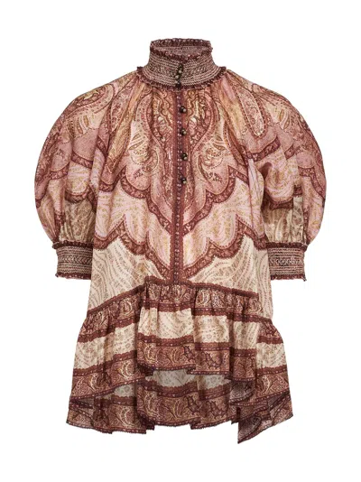 Tapestry-print Burgundy Silk Habotai Wanderlust Blouse In Brown