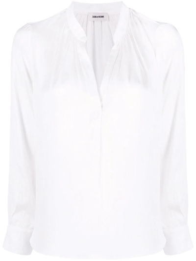 Light Gray Ruffle Blouse With Deep V-neckline In White