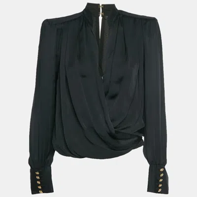 Pre-owned Black Satin Draped Long Sleeve Blouse S