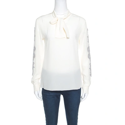 Pre-owned Cream Silk Lace Applique Bow Tie Detail Blouse S
