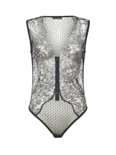 Stretch Lace Bodysuit Scoop Neckline In Black