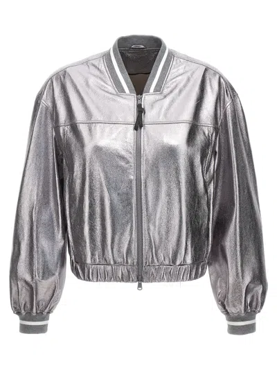 Laminated Leather Bomber Jacket Puffer Jackets Silver In Metallic