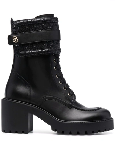 Montana Buckle Boot Low Heels Boots In Black Leather In Animal Print
