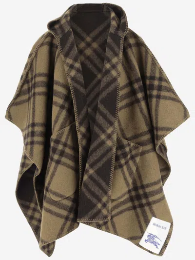 Reversible Check Beige Wool Cape In Brown