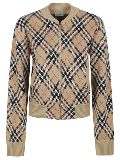 Beige Checked Cardigan With Ribbed Finish In Brown