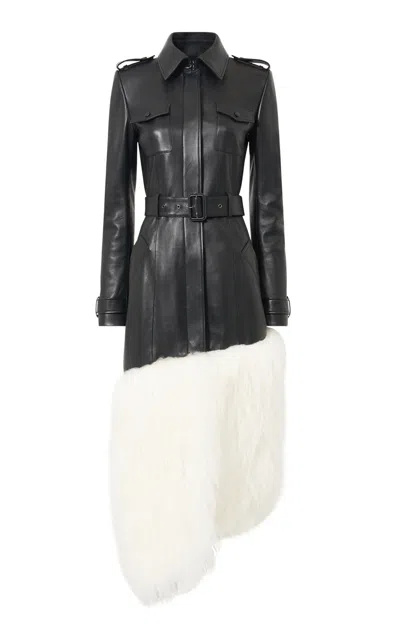 Bi-color Leather Belted Long Trench Coat In Brown