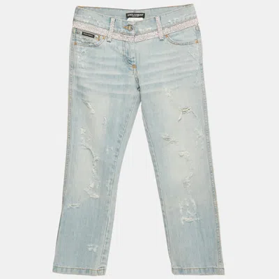 Pre-owned Blue Distressed Denim Rhinestone Detail Crop Jeans S Waist 29"