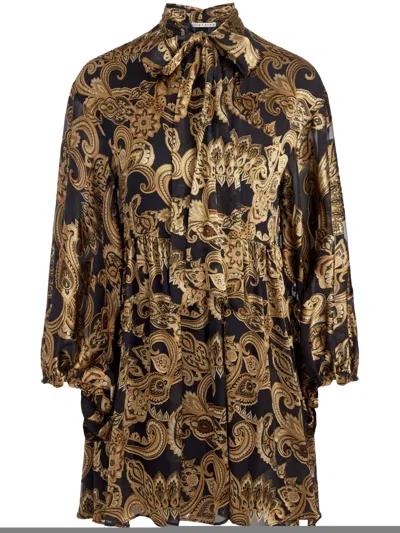 Opal Tie Neck Poet Sleeve Silk-blend Tunic Dress In Brown