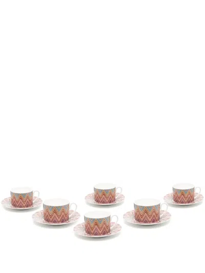 Set Of 6 Porcelain Zigzag Teacups And Saucers In Multi