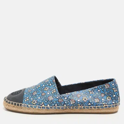 Pre-owned Blue Floral Leather Logo Cap Toe Espadrille Flats Size 38.5