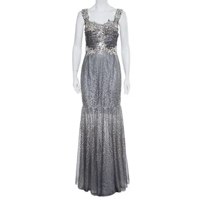 Pre-owned Silver Tulle Crystal Embellished Mermaid Evening Gown M