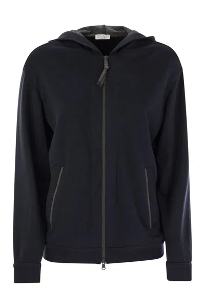 Cotton And Silk Interlock Hooded Topwear With Precious Stripe In Blue