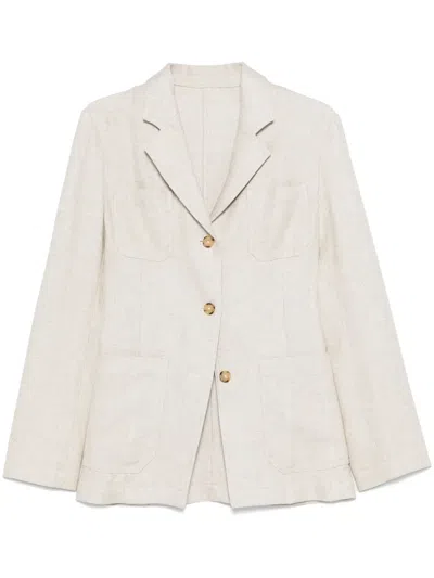Jacquard Linen Blend Blazer With Floral Motif In Neutral