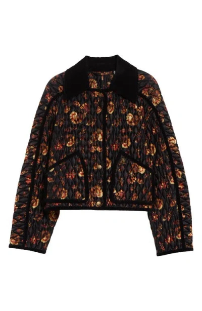 Floral Quilted Nylon Jacket With Corduroy Collar In Black