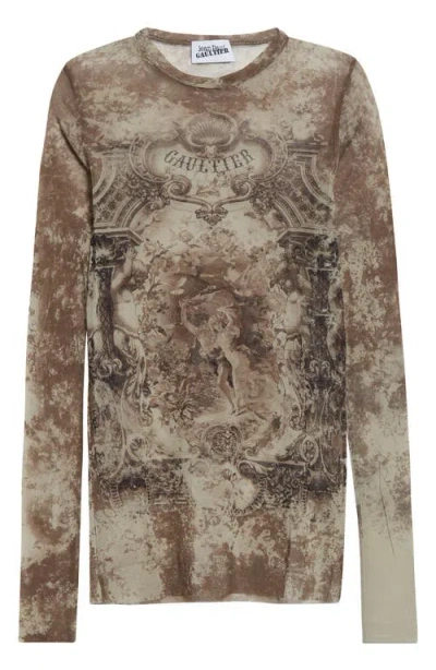 Medallion Print Long Sleeve Mesh Top In Brown