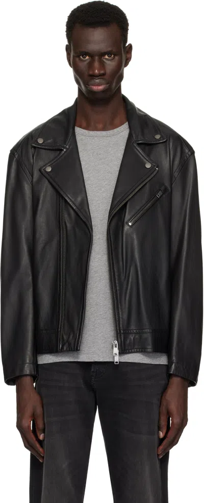 Black Zip Pocket Leather Biker Jacket In 001-black