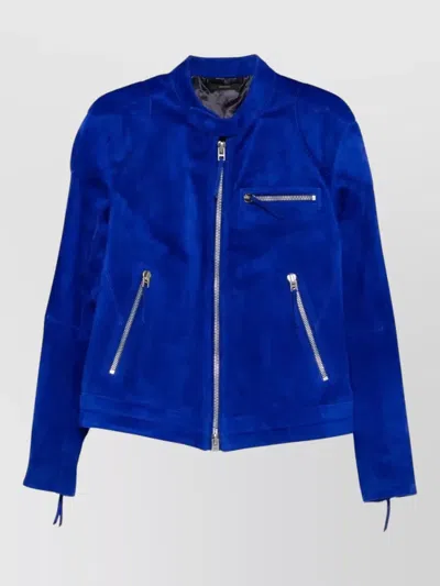 Cashmere Suede Biker Jacket Stand Collar In Blue