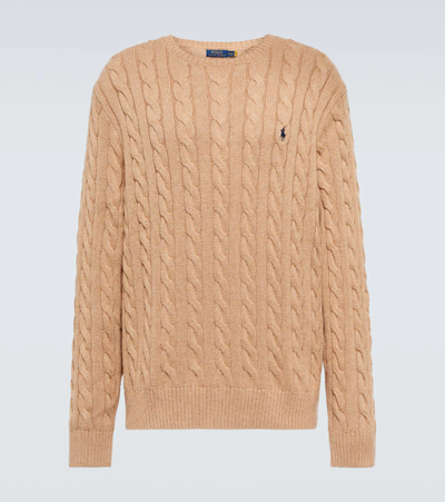 Beige Cable Knit Crewneck Sweater With Pony Embroidery On The Front In Wool And Cashmere Man In Brown