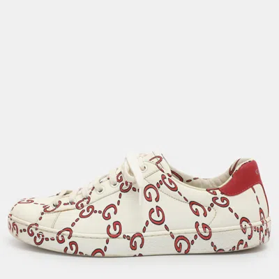 Pre-owned Ace Gg Print Size 40 White Leather Low Top Sneakers