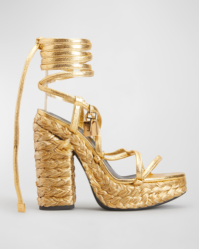 Metallic Rope Ankle-wrap Platform Sandals In Gold