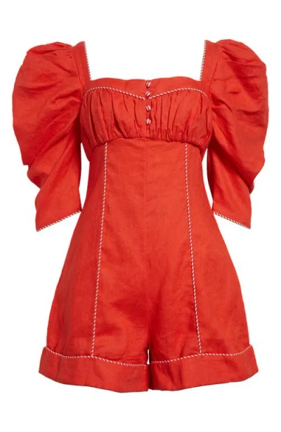 Puff Sleeve Linen Romper In Dark Red