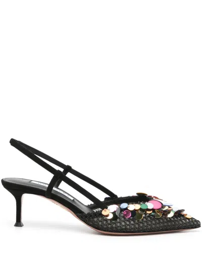 Sequin Embellished Mesh Kitten Heel Pumps In Black