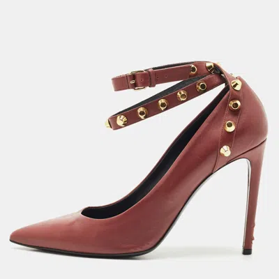 Pre-owned Burgundy Leather Studded Pointed Toe Ankle Wrap Pumps Size 40
