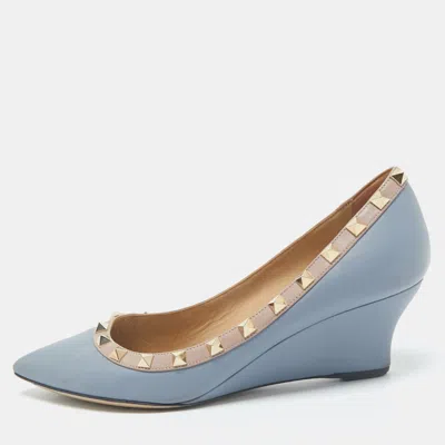 Pre-owned Blue Leather Rockstud Pointed Toe Wedge Pumps Size 37.5