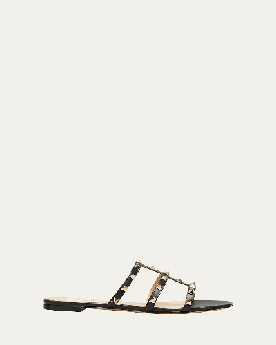 Rockstud Caged Leather Flat Slide Sandals In Black