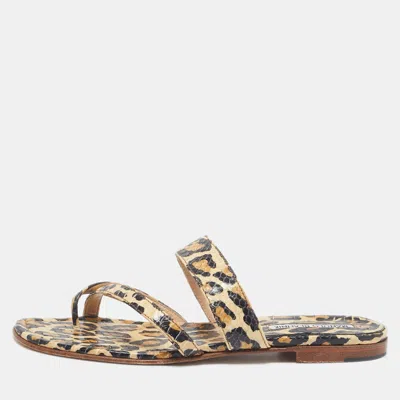 Pre-owned Brown Leopard Pint Python Leather Thong Flat Slides Size 38