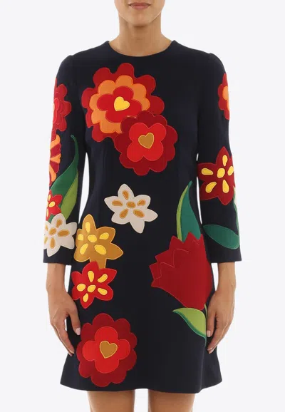 Floral Embroidery Wool Dress In Black