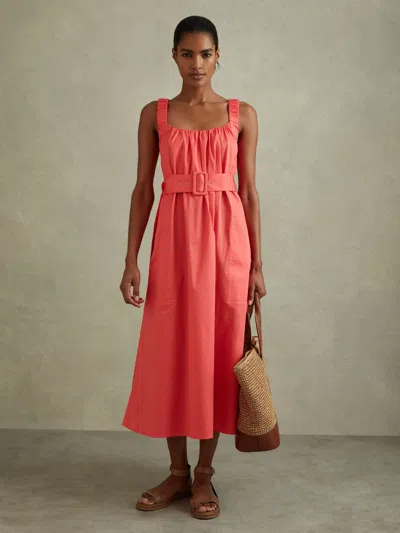 Coral Cotton Ruched Strap Belted Midi Dress In Pink