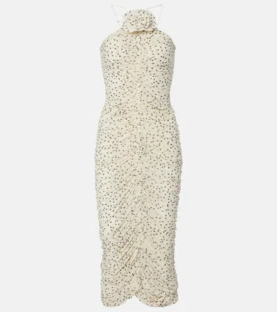 Floral-applique Ruched Caped Midi Dress In Blue