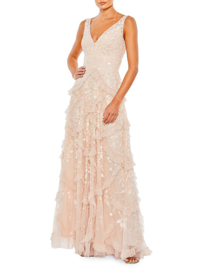 Sequined Scallop Ruffle Tiered V Neck Gown In Blush