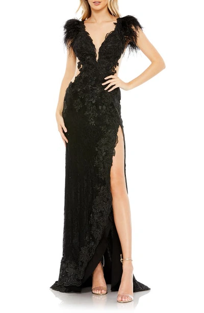Feather Floral Lace Sheath Gown In Black
