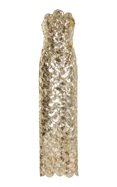 Strapless Sequin Scallop Embroidered Column Gown In Gold