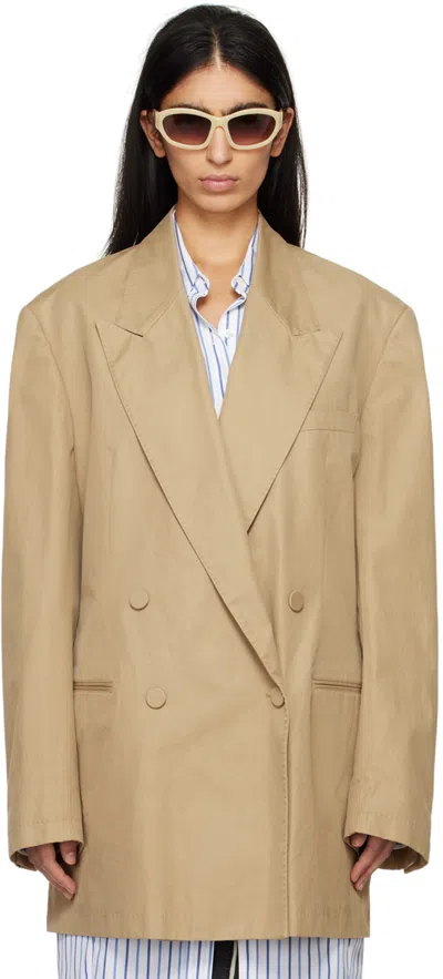 Oversized Double-breasted Feather-trimmed Woven Blazer In Beige