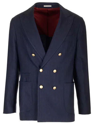 Double-breasted Linen Blazer In Blue