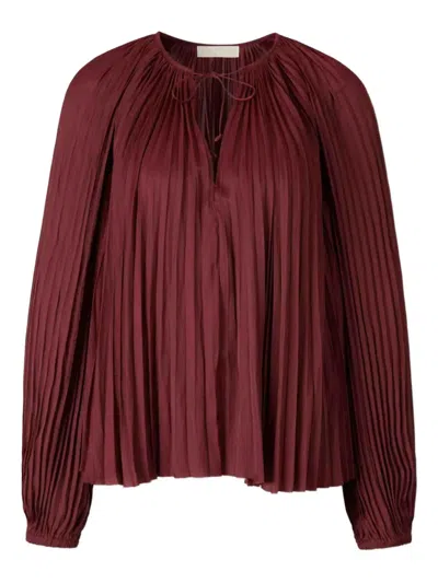 Electra Pleated Satin Peasant Blouse In Burgundy