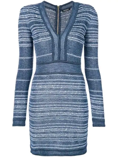 V-neck Long-sleeve Short Striped Tweed Cocktail Dress In Bleu Moyen C3145