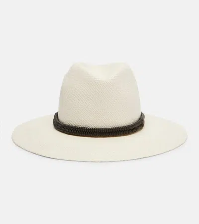 Monili Leather-trimmed Straw Fedora In White