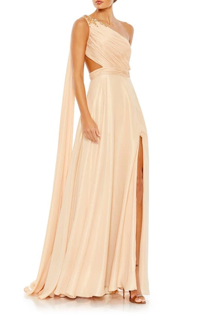 Float One Shoulder Open Back Flowy Gown In Gold Nude